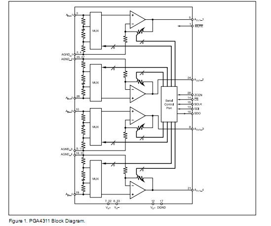 PGA4311U features: (1)Four Independent Audio Channels; (2)Serial Control Interface; (3)Zero Crossing Detection; (4)Mute Function; (5)wide gain and attenuation range: +31.5dB to –95.5dB with 0.5dB Steps; (6)low noise and distortion: 120dB Dynamic Range, 0.0004% THD+N at 1kHz (U–Grade), 0.0002% THD+N at 1kHz (A–Grade); (7)noise-free level transitions; (8)low interchannel crosstalk:–130dBFS; (9)power supplies: ±5V Analog, +5V Digital; (10)available in an SOP-28 package.