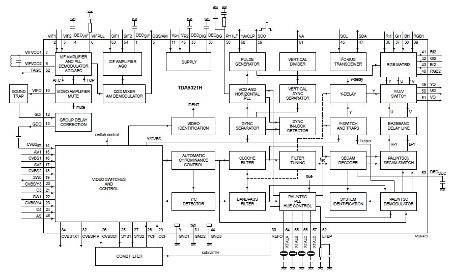 The TDA9351PS N3 2 1698 is an input processor for High-end television receivers. The TDA9351PS N3 2 1698 contains the following functions: Multistandard IF amplifier with PLL demodulator, QSS-IF amplifier and AM sound demodulator, CVBS and Y/C switch with various inputs and outputs, Multistandard colour decoder which can also decode the PALplus helper signal, Integrated baseband delay line (64 ms), Sync processor which generates the horizontal and vertical drive pulses for the feature box (100 Hz applications) or display processor (50 Hz applications). The supply voltage for the TDA9351PS N3 2 1698 is 8 V.